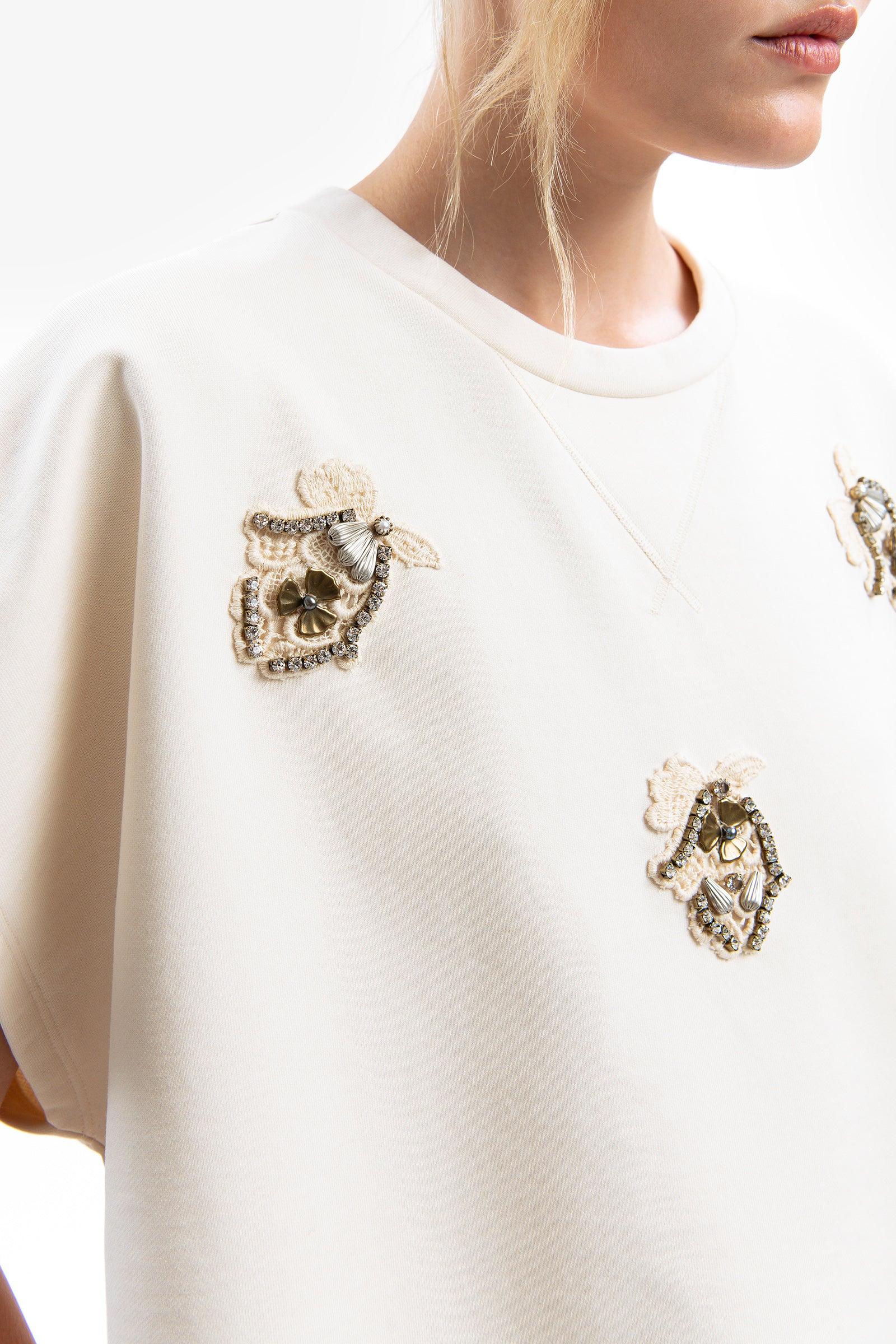 Felpa crop girocollo con maniche corte modello baseball si trasforma con delicati ricami gioiello.