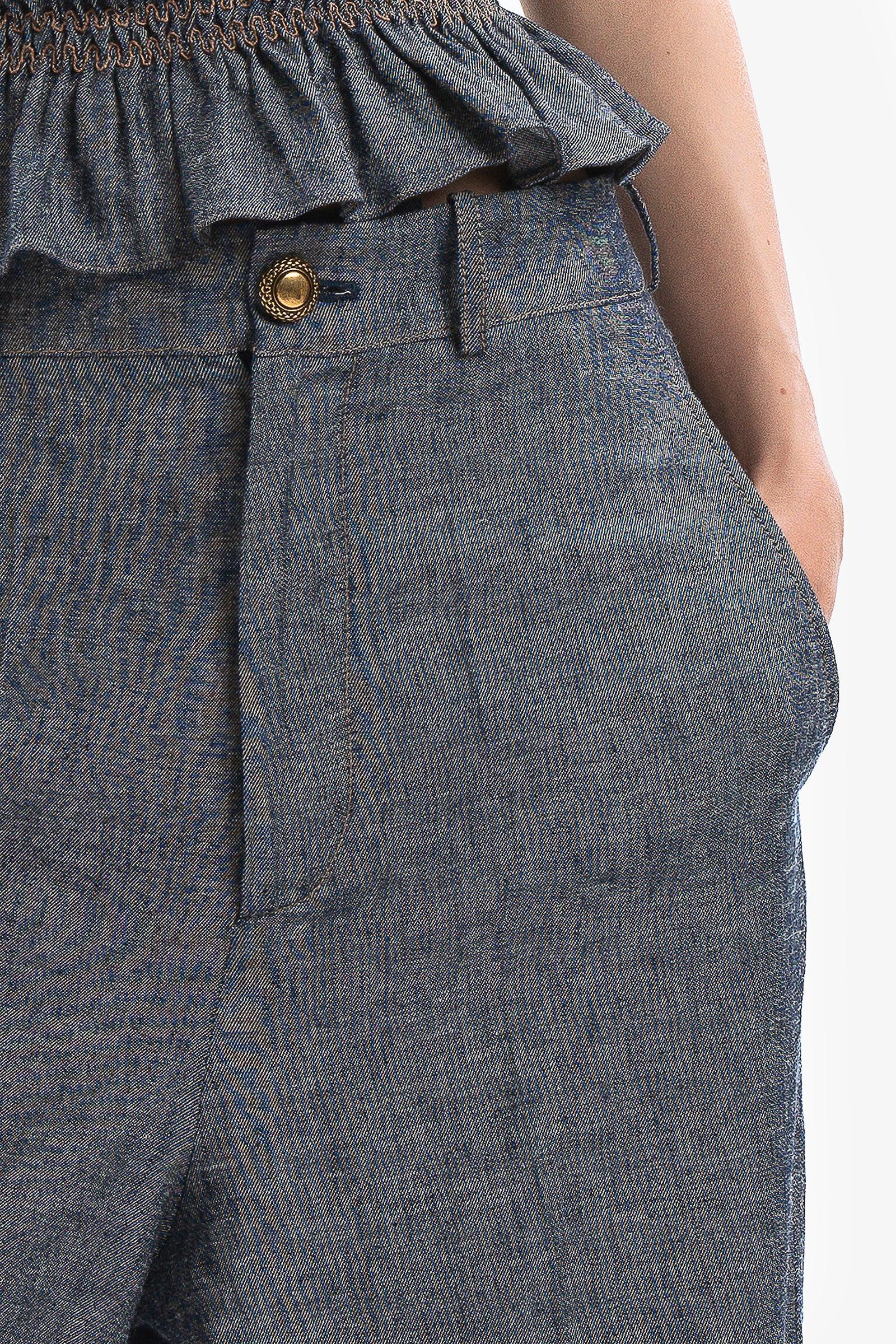 Pantaloni Kristina Ti in lino e viscosa effetto denim a gamba larga con tasche alla francese. Impunture ruggine a contrasto.