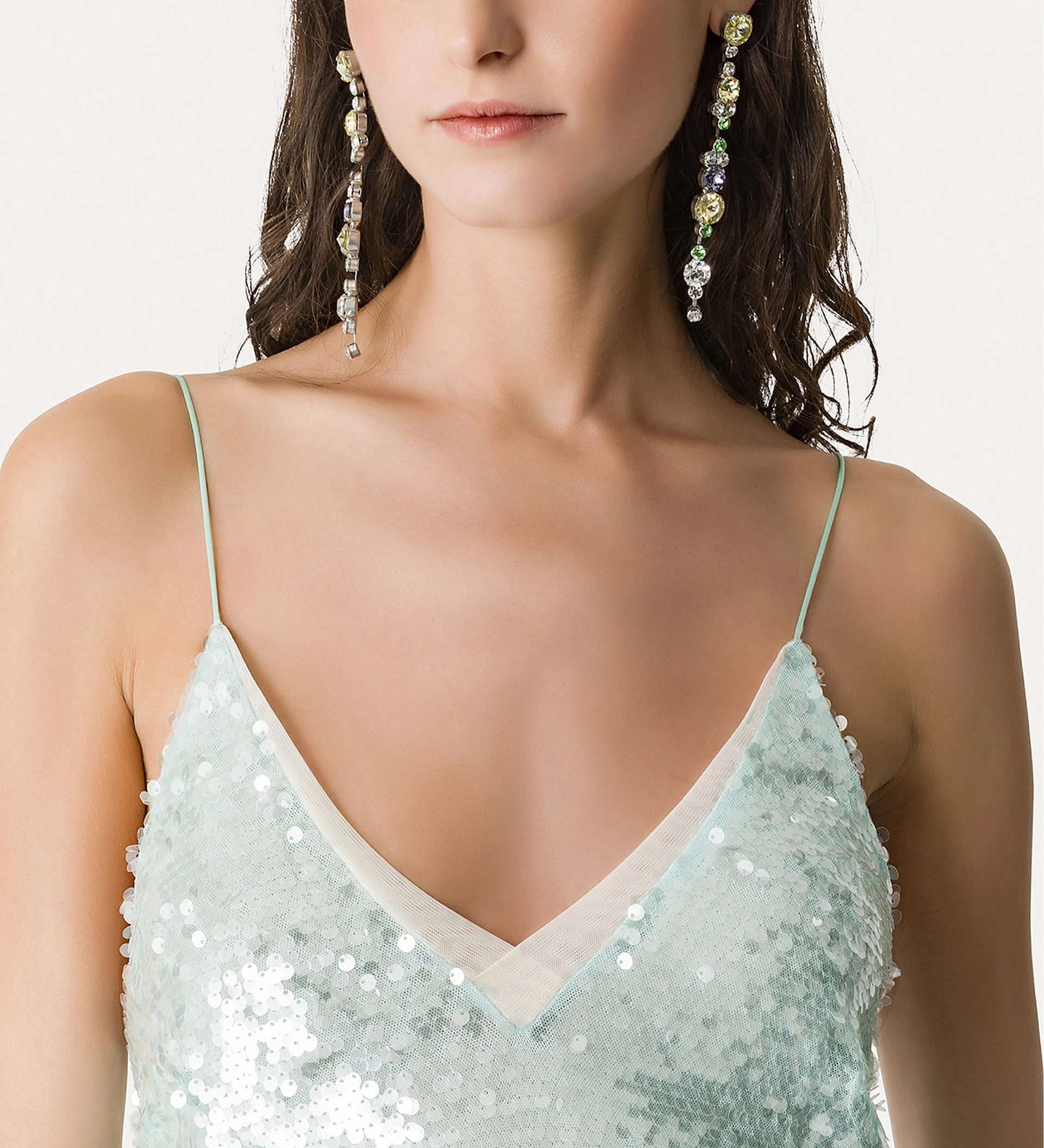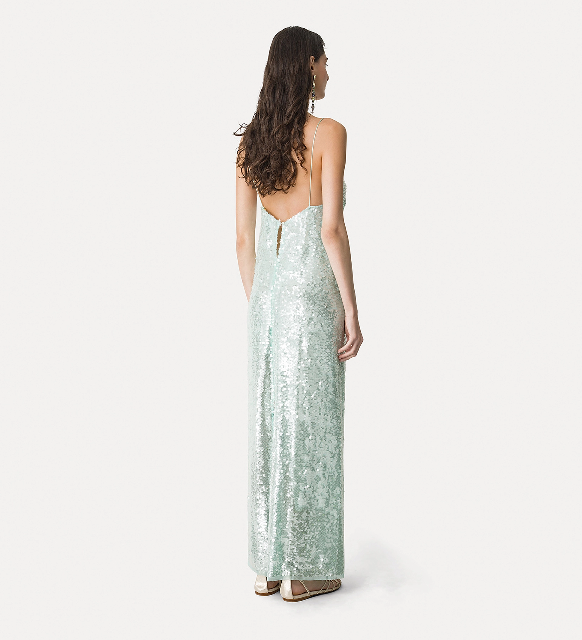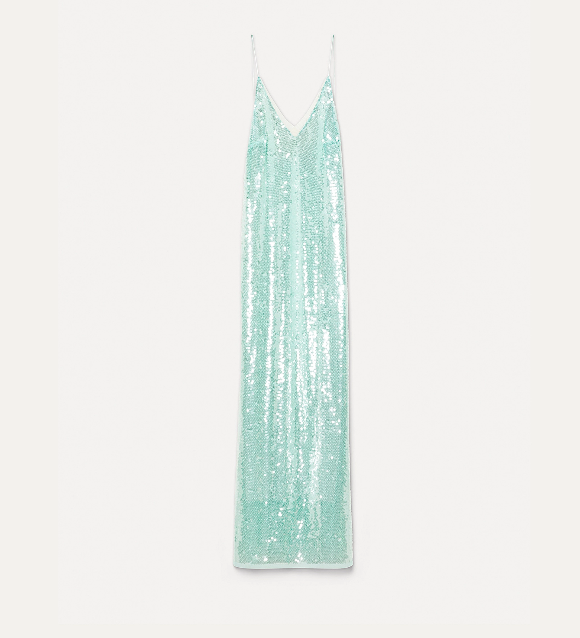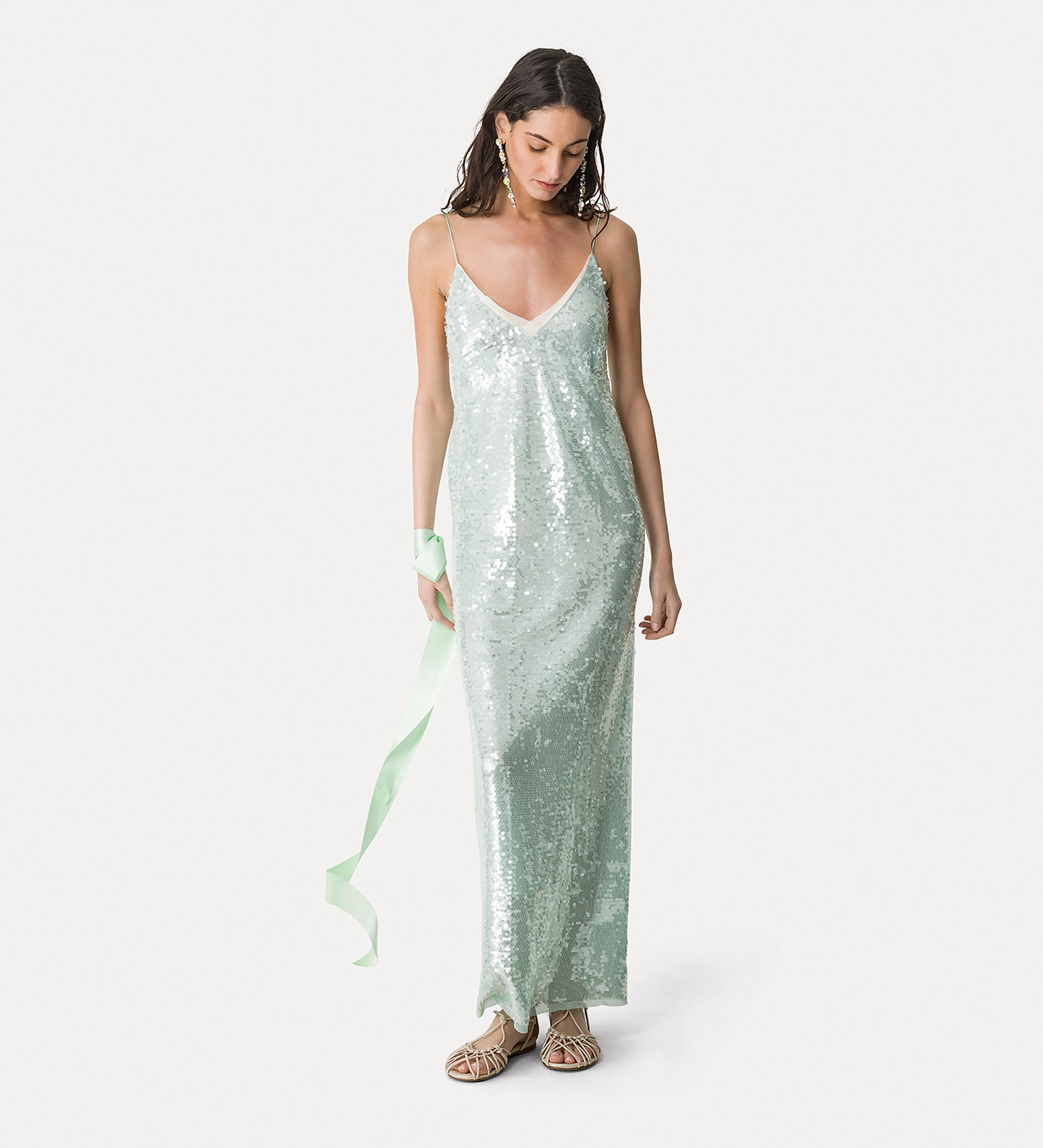 Paillette trasparenti su morbido tulle, spalline sottili e scollo retrò: lo slip dress non è mai stato così sofisticato. Un sogno da indossare, dall’effetto liquido per la luce che riflette, con goccia posteriore per una chiusura dal sapore poetico. Foderato.