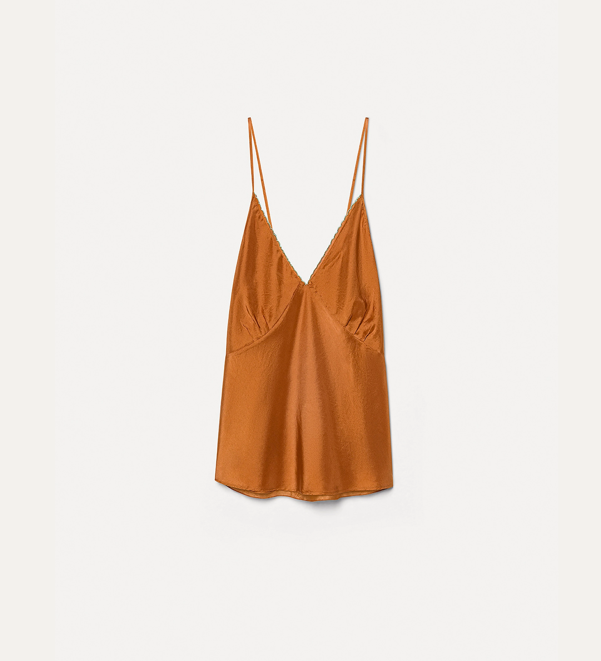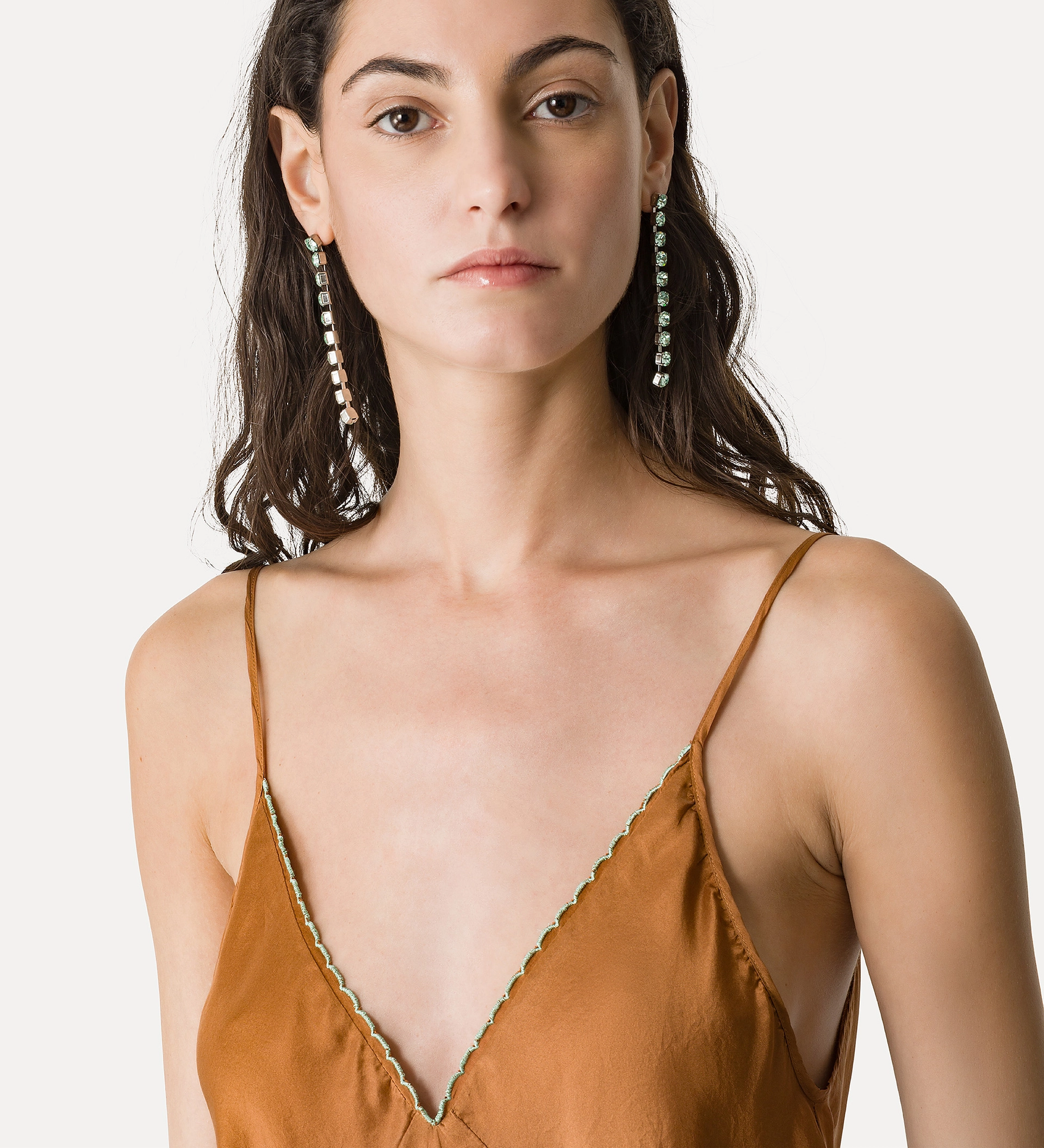 Il top in seta habotai introduce la bella stagione con le sue linee morbide sul busto, le spalline sottili e regolabili, i tagli al seno che si ispirano a una sensualità retrò. il bordo ricamato con cappe aggiunge una nota romantica, pensata per abbinarsi a spolverini di paillette e pantaloni fluidi.